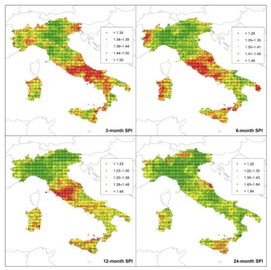 As a result, for almost all the time scales the highest ADI values are localized in large areas of central Italy, mainly in Tuscany and Lazio, reaching values higher than 1.6 for the 3- and 6-month SPI, and higher than 1.7 for the 12-month SPI. A different behavior characterizes the 24-month SPI, with the highest ADI values identified in a small area of the Adriatic side of central Italy (Marche region). Other cells with high ADI values have been detected in the northeastern part of Italy and in a few areas of Apulia, Calabria, and Sicily for the 3-month SPI, in Sardinia, Calabria, Sicily, and Piedmont for the 6-month SPI, and in a few small areas of Sicily and Sardinia for the 12-month SPI.