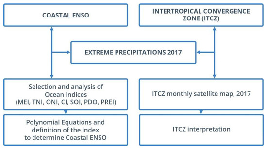For the development of this study, the oceanic indices that define the occurrence of ENSO have been taken into consideration. Data from different indices correspond to the years 2016 and 2017 (January, February, and March) (Appendix A; Table A1, Table A2 and Table A3), in order to determine which of these indices is the most appropriate to define the occurrence of the coastal ENSO. It is likewise with the implications of the ITCZ in the generation of rainfall. In Figure 2 a diagram of the methodological procedure is show.