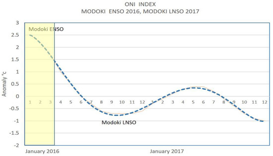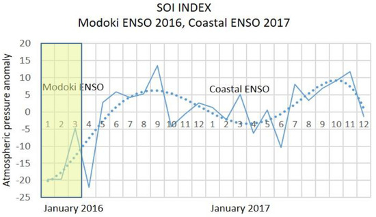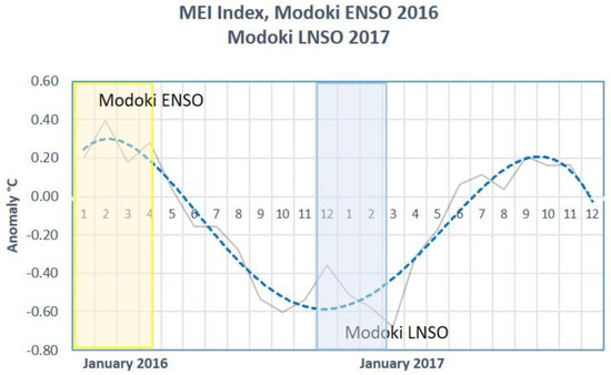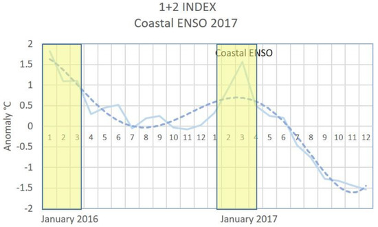 In 2016 (January through March), an increase in the sea surface temperature of 0.30 °C was observed, indicating the occurrence of Modoki ENSO. Later on, sea temperatures decreased to values as low as −0.60 °C in 2017 (January through March), leading LNSO (Figure 3). Surprisingly, this large-scale oscillation from warmer to colder SST and in the same central Equatorial zone of the Pacific Ocean clearly defines the presence of Modoki ENSO and Modoki LNSO, whose process and sequence will also serve to define the presence of coastal ENSO.