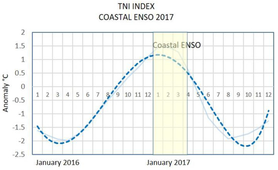 The TNI index is the one that best represents the occurrence of coastal ENSO. The data used are available at: www.esrl.noaa.gov/psd/data/climateindices/List/#TNI (accessed on 21 July 2019). The TNI index measures the gradient of SST anomalies between the Central and Eastern Equatorial Pacific. When the SST gradient is particularly large (for example, positive anomalies in the ENSO 4 Region and negative anomalies in the ENSO 1 + 2 Regions).