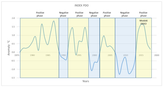 This index has been used to investigate the influence of the PDO on the occurrence of 2016’s Modoki ENSO and 2017’s coastal ENSO. Data have been taken from 1976 to 2018, where positive and negative phases can be observed; the longest positive phase was from 1976 to 1988 (12 years), from this date the cycles of both positive and negative phases have had a minor cyclicality of between 4 to 6 years. During the positive phase of 2013–2018, there was a maximum average temperature increase of the order of 1.6 °C (highest peak presented in 2015–2016), coinciding with the generation of ENSO Modoki (Figure 8).