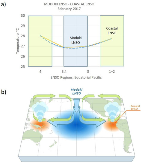 Recent studies focusing on ENSO have shown that changes in the thermocline’s depth (i.e., transition layer between warmer water at ocean surface and cooler water deeper down) are the main cause of sea surface temperature (SST) variations, in the time scale and, consequently, the generation of ENSO events [8]. Models made between ocean and atmosphere can reproduce the aperiodic oscillation of the Pacific between warm states (El Niño) and cold states (La Niña), with an average return interval of 3–4 years [9,10]. El Niño and La Niña are opposite phases of what is known as the “ENSO cycle”.