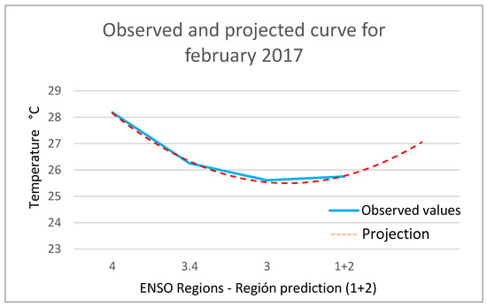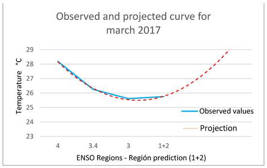 Based on the analyzes carried out of the different indices that define the different types of occurrence of ENSO, an index has been defined consisting of the set of data from regions 4, 3.4, 3 and 1+2, which allows us to identify the coastal ENSO for each month and using the corresponding second degree polynomial equation. This index is the one that best represents the evolution of ENSO, in terms of the coastal ENSO. Figure 9 shows a graph of the occurrence of Modoki LNSO and coastal ENSO, during the months of January to March of 2017. In this study we only analyze the behavior of the ENSO Modoki and Niña Modoki (2016–2017) and for the months of January to March, (months where the ENSO phenomenon generally occurs); therefore, we do not intend to generalize for other periods.