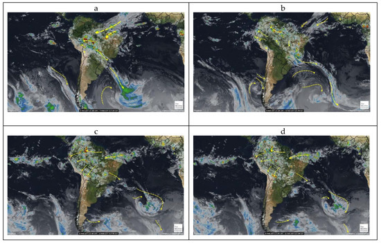 Likewise, satellite images from the Weather Channel (WC) have been used to carry out a qualitative analysis and for comparison to determine the displacement of cloud masses from the ITCZ to the South American continent. The strong convective activity in the ITCZ led to the formation of cloud systems of great vertical development, causing intense rains to the interior of the Ecuadorian and Peruvian coasts [32]. Satellite images were taken for the month of March, the month in which the highest rainfall occurred. In these images, the evolution and displacement of cloud masses were observed, allowing an indirect estimate of rainfall. Images can be obtained from the link: https://weather.com/maps/satellite/southamerica-weather-map (accessed on 22 July 2019).