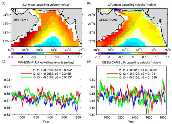 Spatial patterns of JJA mean Arabian Sea upwelling velocity modeled by (a) MPI-ESM-P and (b) CESM-CAM5. Time series of JJA coastal upwelling velocity in the western Arabian Sea modeled by (c) MPI-ESM-P and (d) CESM-CAM5. The area selected for calculating the variable time series is shown in (a,b) within the green line. The plotted time series are smoothed by a 31-year moving mean window and r1, r2, r3 represent the three simulations. t1, t2, t3 are the trends (per 1000 years) of each simulation with p1, p2 and p3 indicating their p-values, respectively, and the star symbols mark the simulations that pass the significance test at the 95% level.