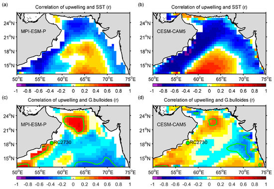 Correlation coefficient between the SST and the upwelling velocity modeled by (a) MPI-ESM-P and (b) CESM-CAM5 with significance level greater than 95% (p-value < 0.05). Correlation coefficient between the G. bulloides abundance and the upwelling velocity simulated by (c) MPI-ESM-P and (d) CESM-CAM5. The green point marks the location of the sediment core where the G. bulloides abundance is recorded. The regions surrounded by the green contour lines present significant correlations that are at a higher level than 90% (p-value < 0.1). All the correlation coefficients are calculated from the detrended time series.