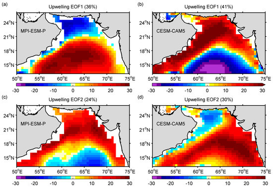 First EOF mode of JJA Arabian Sea upwelling velocity modeled by (a) MPI-ESM-P and (b) CESM-CAM5 and second EOF mode from (c) MPI-ESM-P and (d) CESM-CAM5 with their explained variance in brackets.