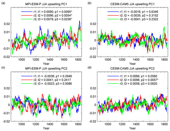 First principal component (PC) time series corresponding to the first EOF mode for all the simulation in (a) MPI-ESM-P and (b) CESM-CAM5 and second PC time series of (c) MPI-ESM-P and (d) CESM-CAM5. The plotted PCs are smoothed by a 31-year moving mean window and r1, r2, r3 represent the three simulations. t1, t2, t3 are the trends (per 1000 years) of each simulation with p1, p2 and p3 indicating their p-values, respectively, and the star symbols mark the simulations that pass the significance test at the 95% level.