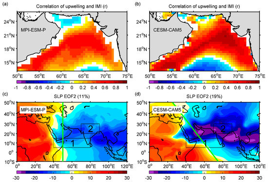 Correlation coefficient between the upwelling velocity and the IMI modeled by (a) MPI-ESM-P and (b) CESM-CAM5. The IMI is calculated by subtracting the U850 wind averaged in box2 from that in box1 (boxes shown in c,d). All the correlation coefficients are calculated from the detrended time series and are significant at the 95% significance level. The second EOF mode of JJA SLP modeled by (c) MPI-ESM-P and (d) CESM-CAM5 with their explained variance in brackets. The green lines demonstrate approximately the simplified boundaries that divide the positive and negative EOF phases.