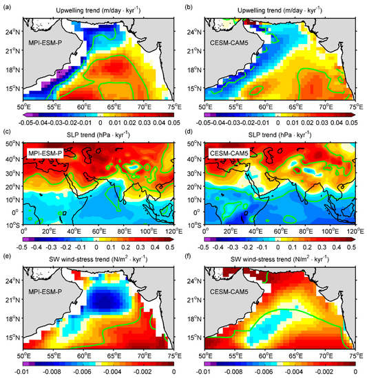 Long-term trends of JJA upwelling velocity modeled by (a) MPI-ESM-P and (b) CESM-CAM5. Long-term trends of JJA SLP modeled by (c) MPI-ESM-P and (d) CESM-CAM5. Long-term trends of JJA SW wind-stress in the Arabian Sea modeled by (e) MPI-ESM-P and (f) CESM-CAM5. The regions surrounded by the green contour lines present significant trends that are at a higher level than 90% (p-value < 0.1).