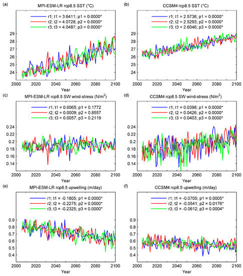 Time series of (a) SST, (c) SW wind-stress and (e) upwelling velocity modeled by MPI-ESM-LR under the scenario of RCP8.5 for the 21st century. (b,d,f) are the same variables respectively modeled by CCSM4. r1, r2, r3 represent the three simulations of each model. t1, t2, t3 are the trends (per 100 years) of each simulation with p1, p2 and p3 indicating their p-values, respectively, and the star symbols mark the simulations that pass the significance test at the 95% level.