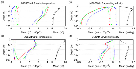 Vertical trends of (a) water temperature and (b) upwelling velocity in the upper 200 m modeled by MPI-ESM-LR. (c,d) are the same but by CCSM4. Solid lines are the results for the RCP8.5 scenario and dotted lines are for the RCP2.6 scenario. The colored lines show the trends of r1 (blue), r2 (red), and r3 (green) in each model. The black lines on the right of each panel present the mean value of the current variable.