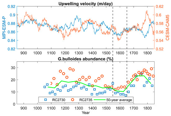 One limitation of this study is that it relies to a great extent on the realism of the models employed, which makes it very difficult to validate the results as there are no available direct observations on upwelling over the time span. However, we do find a connection between our modeled upwelling velocity and the observational sediment records. They present a significant correlation (Figure 2), which indicates the effect of the external forcing. In addition, they also have similar patterns in the time series in terms of the trends. It can be noticed that the long-term trend revealed from the upwelling time series (Figure 1) tends to flip, especially in the CESM-CAM5 model, at around the year 1550. This flip was reported by Anderson et al. [15] where they reconstructed the upwelling index (monsoon winds) from the sediment records over the last millennium. They found a slightly negative trend from 1000 to 1500 and a positive trend thereafter, which is very similar to our finding. Thus, we divided our upwelling time series into two periods based on the flip and calculated the trends separately (Table 3).