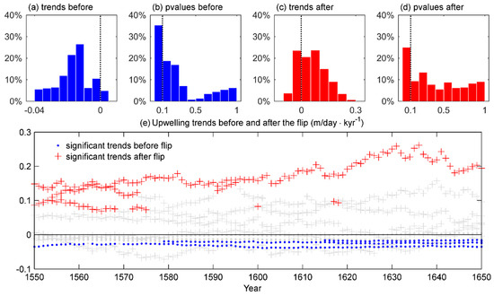 Histograms of (a) trends and (b) p-values for the period before the selected flip point. Histograms of (c) trends and (d) p-values for the period after the selected flip point. (e) Trends before (dot) and after (plus) each flip point from 1550 to 1650. The colored markers show significant trends with p-value < 0.1.