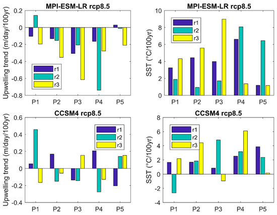 Decadal trends for the future RCP 8.5 scenario in the MPI-ESM-LR (upper) and CCSM4 (lower) models for upwelling (left) and SST (right). P1 to P5 represent the 19-year periods from 2006 to 2100.