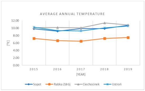 In 2015–2019, the increase in annual air temperature occurred in all health resorts. In the health resorts of Sopot, the average air temperature rises by as much as 0.95 °C in five years. Sopot is located beneath the surface of the ocean air flow from the west, and their impact from the east is low. The proximity of the sea, and especially the depths of Gdansk, influenced the thermal and humid phenomena of the Middle Ages, as well as the diverse geographical environment, especially the diverse topography. The lowest average annual temperatures were recorded in Rabka Zdrój. In 2015, the average annual currency price was 7.24 °C (Figure 2), and as much as 7.50 °C in 2019. In the years 2015–2019, the air temperature is 0.26 °C. Climate change is important for mountainous areas. Mountain ecosystems are highly vulnerable and vulnerable to climate change [32]. The highest average temperature in 2015–2019 in Ciechocinek is 10.53 °C. In the health resorts of Ustroń, in 2015, the average annual temperature was 10.26 °C, in 2016 and 2017, the temperature dropped by about 1 C, and in 2018, there was an increase in the average annual air temperature.