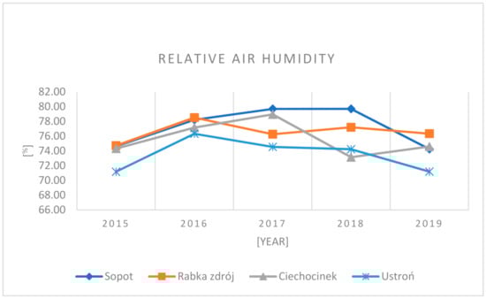 The highest average relative humidity (Figure 4) of 2015–2019 during the analysis period is 77.30% and occurs in Sopot. In Rabka Zdrój the average relative humidity is 76.61%, in Ciechocinek, 75.64%, In the health resort of Ustroń the average relative air humidity is 73.50% The development of basic statistics on meteorological elements is very important in order to determine their impact on concentration levels of harmful air pollutants. This is confirmed by numerous research works carried out by other researchers [34,35]. The relative humidity and air temperature [34] have the greatest impact on the con-centration of sulfur dioxide and particulate matter among meteorological elements. The level of particulate matter pollution of the atmosphere largely depends on meteor-ological conditions, primarily the direction and speed of wind, relative humidity of air, the intensity of solar radiation [35].