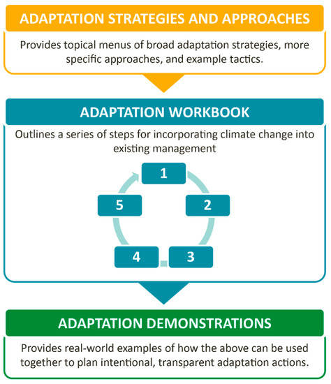 The Adaptation Workbook [10,25] is a simplified adaptive management process optimized for climate adaptation and delivered as a step-by-step workbook. It was designed as a decision support tool to generate focused, explicit climate considerations and proposed actions for integration into broader planning and decision making. It is “simplified” in the sense that there are more comprehensive decision support processes focused on climate adaptation planning [5,11]. The published Adaptation Workbook is what survived testing and feedback by natural resources professionals using this process with their own real-world projects; it includes what they identified as useful and necessary. Nonetheless, it is not a simple process and largely presumes professional experience and judgement. Following the stepwise workbook generates an in-depth examination of a project and requires considerable knowledge and information about the project area, potential management practices, and organizational capacity. Coaching users on the Adaptation Workbook in a workshop setting has helped first-time users feel comfortable with climate change impacts and adaptation topics, and in using the process in subsequent project planning and application.