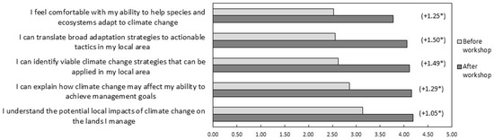Most respondents felt the workshop approaches were effective and increased their overall knowledge and understanding of climate impacts and potential adaptation responses. In particular, responses indicated a high level of agreement that the combination of activities, group discussion, and description of real-world examples were an effective approach at helping people engage in and understand the adaptation planning process (Table 2). Responses to questions addressing participant’s level of knowledge before and after the workshop indicate a consistent increase in understanding and comfort level across multiple aspects of adaptation planning (Figure 2). For example, prior to workshops the respondents reported the lowest level of agreement with the ability to identify adaptation strategies (2.6; scored on a Likert scale from 1 = low to 5 = high) and translating strategies into actionable tactics (2.5) across the six knowledge assessment categories. These same questions had the highest levels of improvement following the workshops, with a score increase of 1.5 within both categories. Highest levels of reported pre-workshop knowledge, along with the lowest change relative to post-workshop level of knowledge was reported for understanding local impacts of climate change (Figure 2). The lowest level of pre- and post-workshop knowledge reported by participants related to their overall comfort in their ability to help species and ecosystems adapt to climate change (Figure 2), suggesting there are additional factors limiting people’s perceived ability to adapt to changes.
