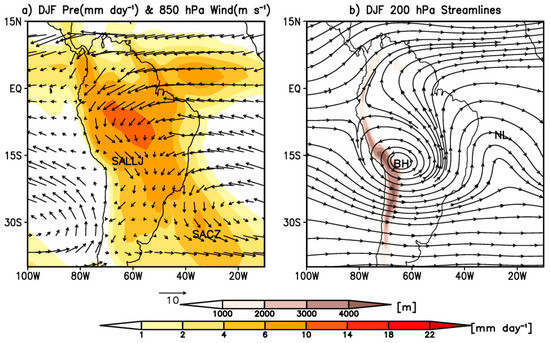 - Chen, T.-S.; Weng, S.-P.; Schubert, S. Maintenance of austral summertime upper-tropospheric circulation over tropical South America: The Bolivian high–Nordeste low system. J. Atmos. Sci. 1999, 56, 2081–2100. [Google Scholar] [CrossRef]