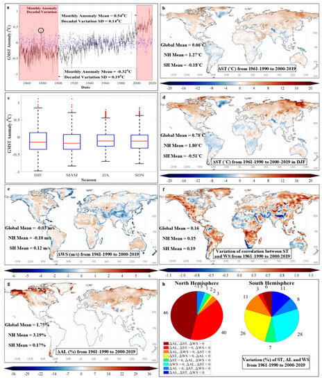 (a); Time series of monthly and decadal GMST anomalies. The 1850–1899 and 2000–2019 periods are shown by pink colors to compare the variations before the 20th century and after the 21st century, (b); variation of the GMST, (c); boxplots of the GMST anomalies. The horizontal line within the box indicates the median (50% percentile). The upper and lower edges of the box represent the 75% and 25% percentile, respectively. The upper and lower ends of the whiskers represent the maximum and minimum values. Outliers are observations beyond the end of the whiskers, (d); variation of the GMST in DJF, (e); variation of WS, (f); variation of the correlation between the GMST and WS, (g); variation of AL, (h); Hemispheric variation of the GMST, AL and WS. (a,c) are plotted based on the HadCRUT-version 4.6 product [20]. (b,d–h) are drawn based on the GLDAS (1° × 1° spatial resolution and monthly temporal resolution) dataset [21].