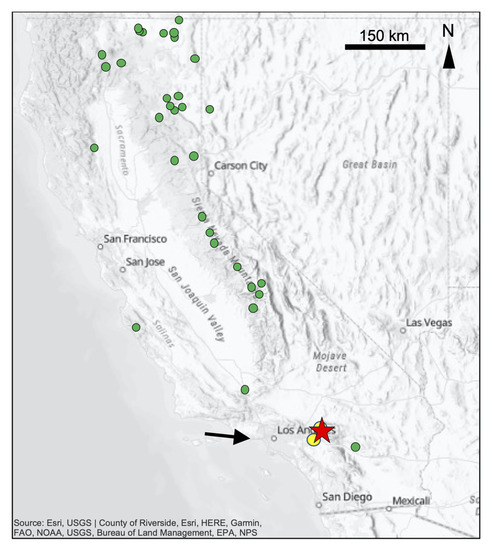 The Transverse Ranges are located north and east of Los Angeles, California, where fossil fuel combustion from transportation and industry has resulted in extremely high levels of air pollution. Nitrous oxides are emitted from the incomplete combustion of fossil fuels. These are then converted to ozone (O3) and additional nitrous oxides, including nitrogen dioxide (NO2). Myriad studies have examined air pollution and its impacts in the Southern California region [21,22,23,24]. Photochemical smog was first identified in Los Angeles in the 1940s, as industrialization and the growth of the motor vehicle industry increased. However, it was not until 1959 that air quality standards were established by the California Motor Vehicle Pollution Control Board and left to the management of the state. In 1970, the Clean Air Act (CAA) authorized the U.S. Environmental Protection Agency (EPA) to establish National Ambient Air Quality Standards (NAAQS) to regulate emissions at the federal level.