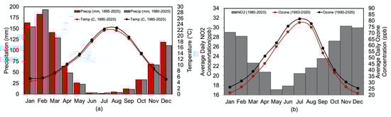 Climatology and pollution over the studied period (a) is the mean climatology over the study site calculated over the length of the time series (1895–2020) and calculated over the common period (1980–2020). Precipitation (1895–2020) given in red bars, precipitation (1980–2020) given in gray bars. Temperature (1895–2020) given in the red line, temperature (1980–2020) given in the black line. Data from PRISM, Spatial resolution 4km2, Lat: 34.25° N, Lon: 117.29° N [47]. (b) is the average daily concentrations of O3 per month over the length of the time series (1963–2020) given in the red line and over the common period (1980–2020) given in the black line and NO2 per month (1980–2020) given in the gray bars at the study site. Data from EPA AIRS [46].
