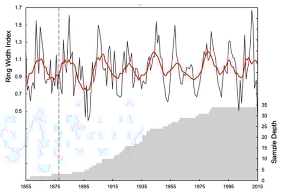 Tree ring chronology for the Crestline ponderosa pine. A 10-year running mean is plotted in red and the number of tree samples used is shaded in gray. The point at which the chronology exceeds an expressed population (EPS) threshold of 0.85 is given by the dashed line.