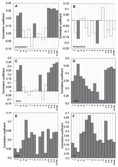 Relationships between the Crestline tree ring chronology and selected months and seasons for (A) total precipitation (1895–2015), (B) average temperature (1895–2015), (C) average SPEI (1901–2015), (D) average PDSI (1933–2015), (E) daily average NO2 concentration (1980–2015), and (F) daily average O3 concentration (1963–2015).