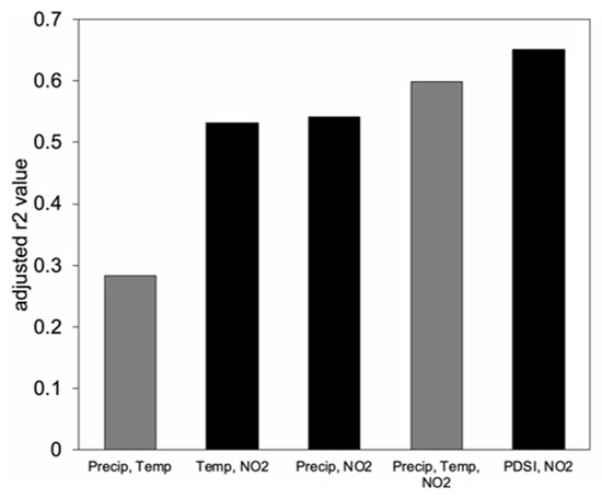 Adjusted r2 values produced by different stepwise regression models. Variables included in the models were precipitation (pOct–Sep), temperature (pOct), NO2 (pOct–Sep), and PDSI (March). The gray bars indicate all variables in the stepwise regression were significant at the 95% level (p < 0.05), the black bar indicates all variables were significant at the 99% level (p < 0.01).