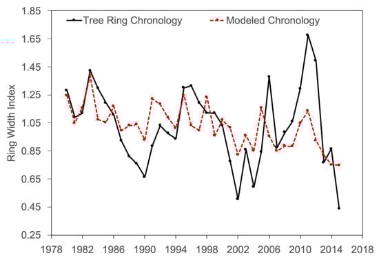 A stepwise multiple linear regression showed that the most important driver of ring-width increment is NO2 during the water year (pOct–Sep), which is also observed in the individually computed correlations (Table 3). PDSI during March is also a significant driver of growth and, with NO2 (pOct–Sep), explains a significant component of tree ring growth variability (r2-adj = 0.65, p < 0.001). Combinations of precipitation (pOct–Sep), temperature (pOct), NO2 (pOct–Sep), and PDSI (March) can be used to represent tree ring variability in several step-wise regression models (Figure 5). Precipitation is found to be the primary driver of ring-width increment size when only precipitation and temperature are used (Figure 5). However, when NO2 is introduced, the model results in a far more significant adjusted r2 value (Figure 5). PDSI and precipitation as well as PDSI and temperature were found to covary (VIF > 3) and, thus, are not included together in any stepwise regression model. Similarly, ozone and nitrogen dioxide were found to covary (VIF = 3.4) and are not included together in any model for the same reason. The models that yielded the highest adjusted r2 values and, thus, best represented the tree ring chronology were PDSI and NO2 (r2-adj = 0.65, p < 0.001) and temperature, precipitation, and NO2 (r2-adj = 0.60, p < 0.05). Using the PDSI (Mar) and NO2 (pOct–Sep) to reconstruct the tree ring chronology yields the strongest correlation (r2 = 0.671) (Figure 6). The individual climate response analyses and the stepwise multiple regressions indicate that drought conditions (PDSI) at the end of the rainy season (March) and NO2 pollution during the growing year (pOct–Sep) exhibit primary controls on growth for ponderosa pine growing in this region.