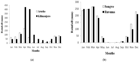 The study area was purposively selected based on the level of Arabica coffee production. It comprised of two major Arabica coffee growing zones: the Northern Highland zone (Kilimanjaro and Arusha regions) and Southern Highland zone (Songwe and Ruvuma regions) (Figure 1). In these zones, Arabica coffee production is exclusively rain-fed. The Northern Highlands zone is characterized by a bimodal rainfall pattern, while the Southern Highland zone experiences a uni-modal rainfall pattern. The bimodal rainfall is characterized by a long rainfall season (March–May) and short rainfall season (October–December), whereas the uni-modal type receives rainfall for seven months (November–May) (Figure 2).