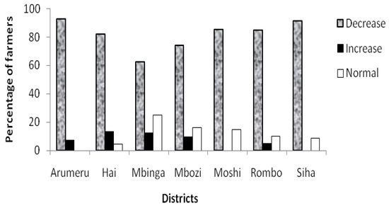 Farmers’ perceptions were compared with the results of the historical trends from meteorological data. Figure 3 shows farmers’ perceptions of changing in rainfall amount categorized based on their respective districts. Many famers (above 70%) felt declining rainfall in their areas, with the exception of farming households from Mbinga districts where only 62% had a similar feeling of rainfall decline. Looking at the meteorological data from two districts one from Northern Highlands zone (Hai) and another from the Southern Highlands zone (Mbozi), we find that approximately half of the years within the study period experienced below average annual rainfall.