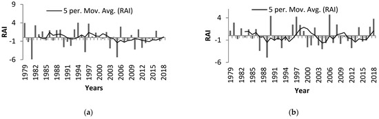 The average rainfall amount for Lyamungo was 1447.79 mm, while the highest average annual rainfall was 2194 mm recorded in 2006 and the lowest was 670 mm recorded in 1989. For the case of Mbimba, the average rainfall amount was 1342.79 mm, the highest average annual rainfall was 1693 mm recorded in 1994, while the lowest was 630 mm recorded in 1981. Figure 4a,b reveal that there is persistent high variability in annual rainfall based on a 5-year moving average. The 5-year moving average trend lines are not consistent throughout the 40-year period. The RAI for Lyamungo indicates that in the first and second decades, only five years respectively recorded an average rainfall above the average for the entire period. In the third decade and fourth decades, only 4 and 3 years respectively recorded an average rainfall above the average of the 40-year period. On the other hand, the RAI for Mbimba reveal that in the first and second decades, six years recorded an average rainfall above the average for the entire period. In the third decade and fourth decades, only 3 and 2 years respectively recorded above-average rainfall of the 40-year period. Hence, the fourth decade (2009–2018) was the driest of all four decades in both sites.