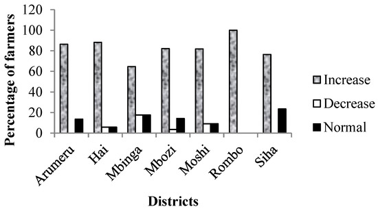 The majority of farmers from the two major Arabica coffee growing zones in Tanzania were aware of climate change and had positive perceptions of climate change (increase in temperature and decrease in rainfall). These findings are in agreement with other studies conducted in Tanzania by [9,23]. The average annual linear trend for the four decades vividly shows that temperature at Lyamungo (Northern Highlands zone) and Mbimba (Southern Highlands zone) has been increasing. The meteorological data on rainfall also reveal that rainfall amount had decreased just as the respondents perceived. The consistency of farmers’ perceptions with meteorological data in terms of temperature increase and rainfall decrease have also been reported by [9,22].