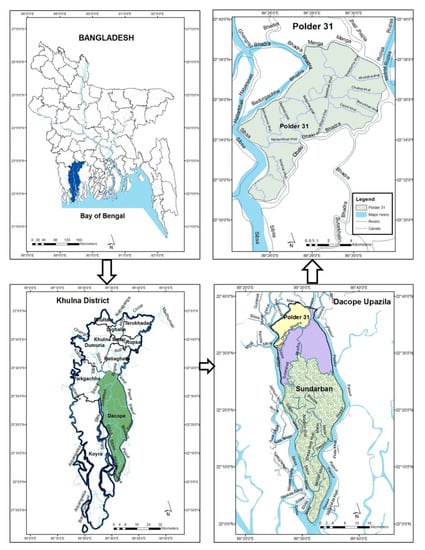 The study was conducted in Khulna district, which is situated in the southwest coastal region of Bangladesh (Figure 1). The district consists of nine upazilas (sub-districts), and Dacope is the second largest upazila after Koyra. The upazila faces the common natural hazards of coastal Bangladesh, such as cyclone, storm surge, salinity intrusion, river and coastal erosion, water logging, and seasonal flood, and represents the typical geophysical and socioeconomic settings of sea-facing southwest coastal Bangladesh. The upazila consists of three different polders, namely polders 31, 32, and 33. Among these, Polder 31 faces the negative impacts of climate variability and change more than the other two [25], and hence it was selected for this study. Untimely rain, unusual heavy rainfall, high temperature, prolonged drought, and other natural disasters had been disrupting the local livelihoods in the upazila for the last few decades.