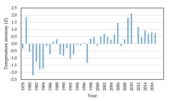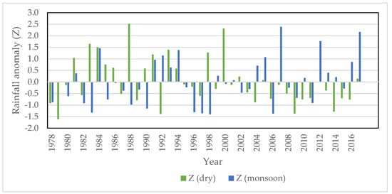 The rainfall determined for each year can be used to understand the nature of variability, to determine the dry and wet years in the record, and to assess the frequency and severity of drought [33,34,35]. Z was calculated as: