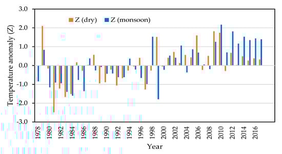 Variabilities in annual and seasonal mean temperatures were assessed by plotting the values against time (Figure 2 and Figure 3). The figures indicate how much variability each year had encountered during the past 40 years. In the case of annual temperature, earlier years showed the highest variability, then it decreased a little, but in recent years (1997, 2006, 2009, and 2010) a notable variability was recorded. Though the temperature variation in the dry season indicated a decrease in variability in the recent years, the variation in the monsoon season showed an increase in variability since 2009. The overall results indicated that there was a significant rise in temperature variability with time in southwest coastal Bangladesh.