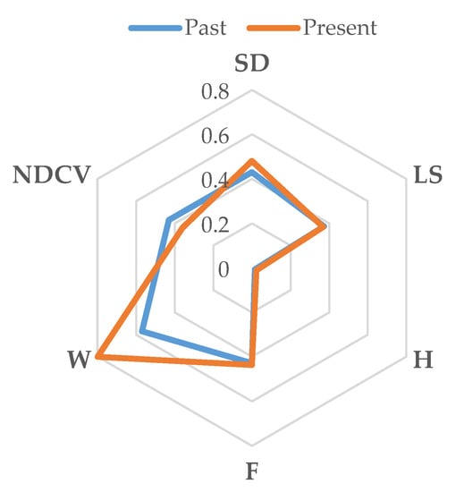 While the above narratives by the local people from their lived experiences provided a qualitative picture of their vulnerability to climate variability, a quantification of the impacts was also necessary to better understand the actual vulnerability. To quantify the impacts, was calculated for Polder 31 using Equation (10), and the results are presented in Table 5. The s for the past and present decades in the table were calculated based on major component values in Table 6 and Table 7. A visual representation of the major component values of the past and present s is shown in Figure 5 for an easy comparison. Overall, the present decade had a higher LVI than the past, indicating a relatively greater vulnerability of livelihood to climate variability and change impacts in the present decade.