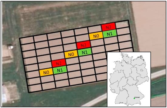 Location of experimental plots (4 × 8 m2) fertilized with calcium ammonium nitrate across the long-term field experiment (N0 without fertilization, N1 moderately fertilized, N2 highly fertilized).