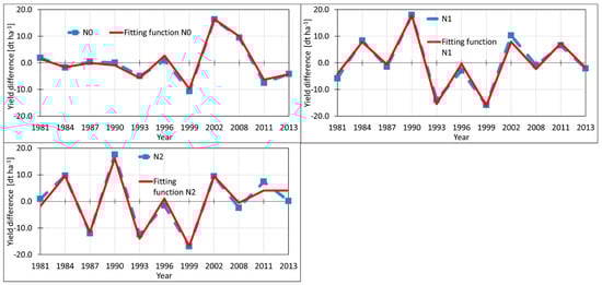 In summary, the quality of the derivations for unfertilized (N0) and moderately fertilized (N1) plots was excellent. In contrast, the divergence between observation and regression of the yields of variant N2 (highly fertilized plot) was distinctly more considerable, especially from 2008 to 2011. The selection of only two significant influencing parameters was the main statistical reason.