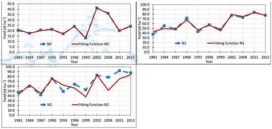 The smoothing lines in Figure 2 indicate an increasing trend in the yields. While the yield rates of the N0 plots were low, the fertilized variants (N1 and N2) showed nearly a double yield.