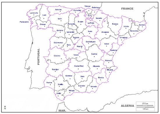 The climate of peninsular Spain is mainly divided into 3 types: oceanic, continental, and Mediterranean. Atlantic Spain (with an oceanic climate) extends from Galicia to the Pyrenees (Table 1—Galicia, Asturias, Cantabria, La Rioja, Navarra, and País Vasco). The Mediterranean inland climate extends mainly through the Central Plateau (Table 1—Castile and León, Castilla–La Mancha, and Extremadura). Its climate is Mediterranean but with continental characteristics due to the peninsular orography. The Mediterranean Coastal climate extends over the whole Mediterranean coast of Spain (Table 1—Cataluña, Comunidad Valenciana, and Murcia). The Andalusia region has all three characteristics: the Atlantic influence in its Atlantic coastal provinces (Huelva and Cádiz, oceanic climate), the Mediterranean with continental characteristics (Sevilla, Córdoba, and Jaén), and the Mediterranean (Granada, Málaga, and Almería) [34]. For the purposes of this study, 4 zones were considered taking into account the mentioned climate characteristics.