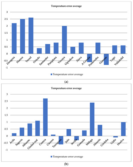 Temperature error average. The errors did not exceed 3 °C for the monthly average in temperatures in (a) either in (b).