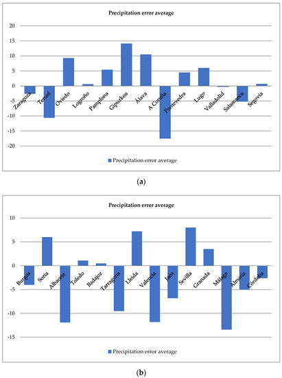 Precipitation error average. The errors did not exceed 20 mm for the monthly average in precipitation in (a) either in (b).