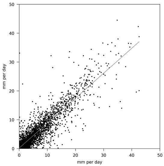 The validation steps (i)–(vi) were applied for rainfall and discharge observations. The comparison of daily precipitation observations after validation shows a good correlation (Pearson correlation 0.91), allowing the conclusion that the seven stations mostly recorded similar values (Figure 2). Discharge measurements were validated using cumulative sums of available gauges. An inter-stational validation for temperature data was not directly possible, as this variable is recorded at only one location within the catchment. However, the general observed pattern was compared with regionally available temperature observations for consistency.