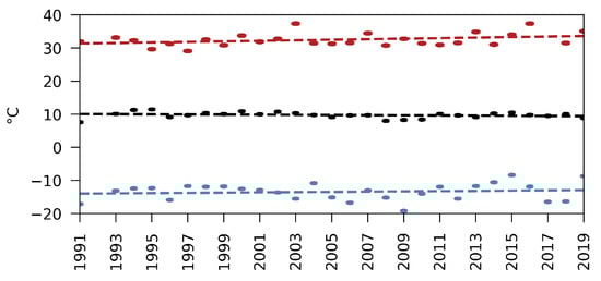 While the development of annual minima shows no significant trend, annual temperature maxima were increasing between 1991 and 2019. The mean annual minimum 1991–2019 is −13.4 C, with the lowest recording in 2009 (−19.2 C) and the highest recording in 2015 (−8.3 C). The mean annual maximum 1991–2019 is 32.5 C, with the lowest recording in 1997 (29.1 C) and the highest recording in 2003 and 2016 (37.4 C) (Figure 3).