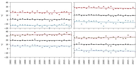 The mean spring temperature between 1991 and 2019 is 10.0 C and shows a similarly decreasing trend as observed for winter. The lowest mean was recorded in 2009 (7.6 C) and the highest recording in 1995 (12.1 C). The trend of spring minima is decreasing around a mean minimum of −5.5 C, with the lowest recording in 2018 (−16.3 C) and the highest record observed in 2011 (−1.2 C). The trend of spring maxima 1991–2019 is also decreasing around 27.0 C, with the lowest recording in 1991 (23.1 C) and the highest recording in 1999 (30.9 C) (Figure 4 top right).