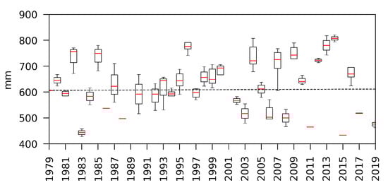 The mean spring precipitation accounted for 151.9 mm for 25% of the mean annual precipitation 1979–2019. The largest spring precipitation was recorded in 1985 (272.5 mm) and the smallest in 2003 (66.7 mm) (Figure 6 top right).