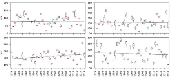 Precipitation of the 7 stations (25% and 75% percentile, median (red)) and trend 1979–2019 (dashed line) for winter (top left), spring (top right), summer (bottom left), and autumn (bottom right).